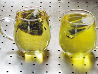 立體茶包(左)沖泡時,可清楚看到茶葉很完整,